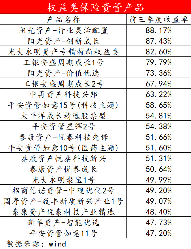 Wind数据统计显示,今年前三季度,260多款保险资管权益类产品平均收益率约24%,超过沪深300约18%的涨幅;其中,超9成产品实现正收益,14款产品收益率超过50%,科技、医药等主题产品收益率表现较好。